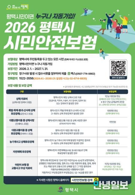 안녕일보 배윤 기자 | 평택시는 일상생활에서 예기치 못한 재난·사고 피해를 지원하기 위한 '2026년 평택시 시민안전보험'을 갱신하고, 시민 누구나 혜택을 받을 수 있도록 홍보에 나섰다고 밝혔다.