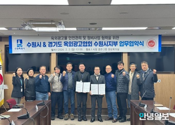 안녕일보 배윤 기자 | 수원특례시와 경기도 옥외광고협회 수원시지부가 2일 시청 영상회의실에서 ‘옥외광고물 안전관리 강화를 위한 업무협약’을 체결하고, 협력을 약속했다.