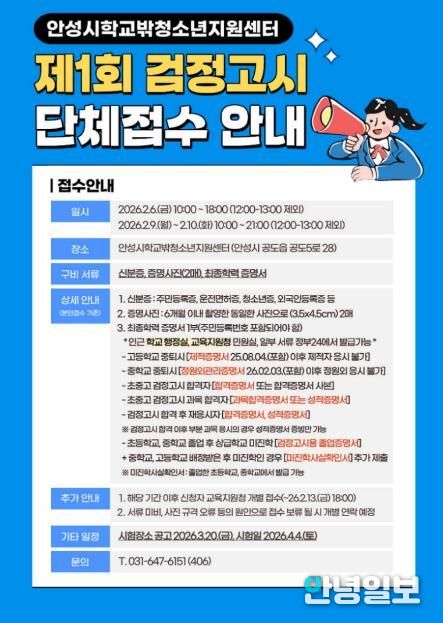 안녕일보 배윤 기자 | 안성시학교밖청소년지원센터는 오는 4월 4일 시행되는 2026년도 제1회 검정고시와 관련하여 단체원서접수를 진행한다고 밝혔다.