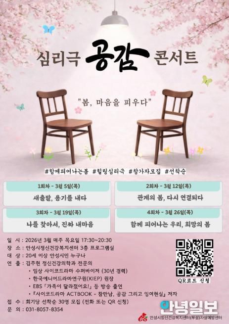20세 이상 안성시민 누구나 무료로 참여할 수 있으며, 신청은 2월 6일부터 3월 25일까지 QR코드 또는 안성시정신건강복지센터 홈페이지를 통해 선착순으로 120명을 모집한다.