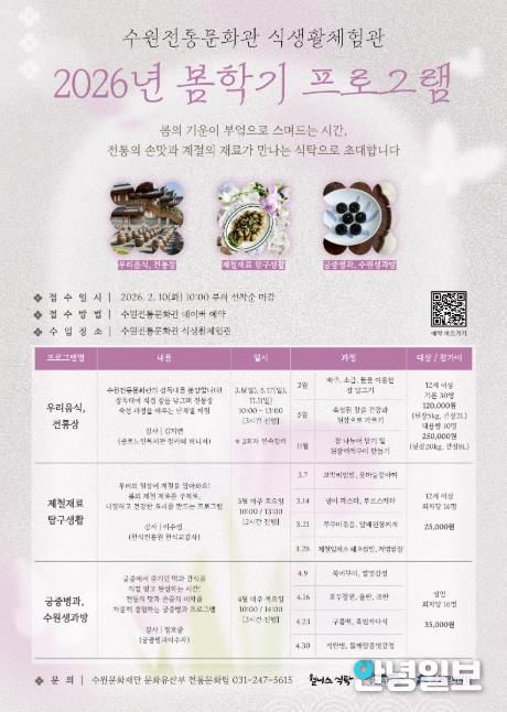 안녕일보 배윤 기자 | 수원문화재단은 오는 10일부터 수원전통문화관 식생활체험관 2026년 봄학기 프로그램 참여자를 모집한다. 이번 봄학기 프로그램은 계절의 변화에 맞춘 전통 식문화와 다양한 음식을 시민들이 쉽고 재미있게 경험할 수 있도록 기획했다. 전통장 담그기부터 제철 식재료 요리, 궁중병과 체험까지 다양한 내용으로 운영한다.