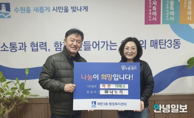 안녕일보 배윤 기자 | 수원시 영통구 매탄3동 행정복지센터는 지난 6일, 관내 폐기물 수거업체인 ㈜나누리로부터 설 명절을 맞아 어려운 이웃을 위한 라면 15박스를 기탁받았다고 밝혔다.
