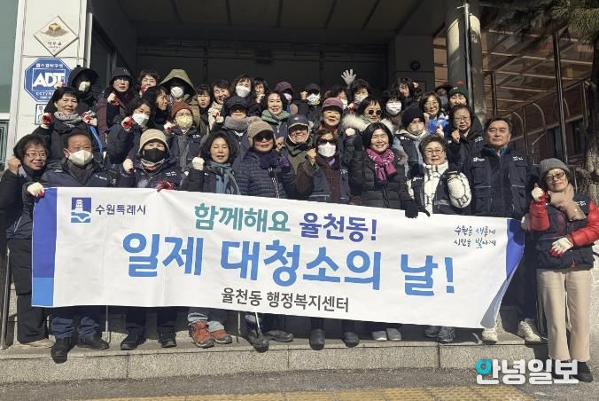 안녕일보 배윤 기자 | 수원시 장안구 율천동 행정복지센터는 지난 6일, 민족 최대의 명절인 설 연휴를 대비하여 통장협의회 및 직원 등 60여 명이 함께 참여하여 설맞이 일제 대청소를 실시했다.