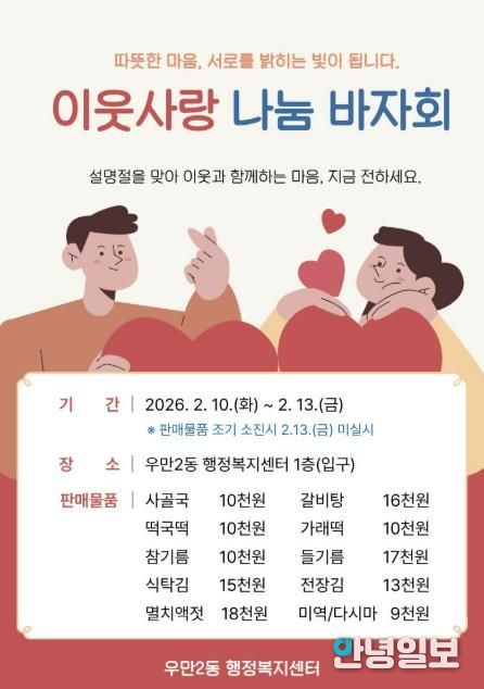 안녕일보 배윤 기자 | 수원시 팔달구 우만2동 지역사회보장협의체는 설 명절을 앞두고 오는 2월 10일부터 13일까지 우만2동 행정복지센터 청사 입구에서 ‘사랑나눔 바자회’를 개최한다고 밝혔다.