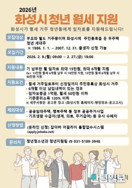 안녕일보 배윤 기자 | 화성특례시가 청년들의 주거비 부담을 덜고 안정적인 주거 생활을 지원하기 위해 2월 9일부터 2월 27일까지‘청년 월세 지원 사업’ 신청자를 모집한다고 밝혔다.