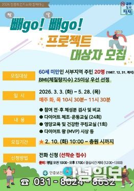 안녕일보 배윤 기자 | 평택시 안중보건지소는 지역 주민의 건강한 체중 관리와 비만 예방을 위해 상반기 ‘빼go! 빼go! 프로젝트’ 프로그램을 운영하고, 참여자를 모집한다고 밝혔다.