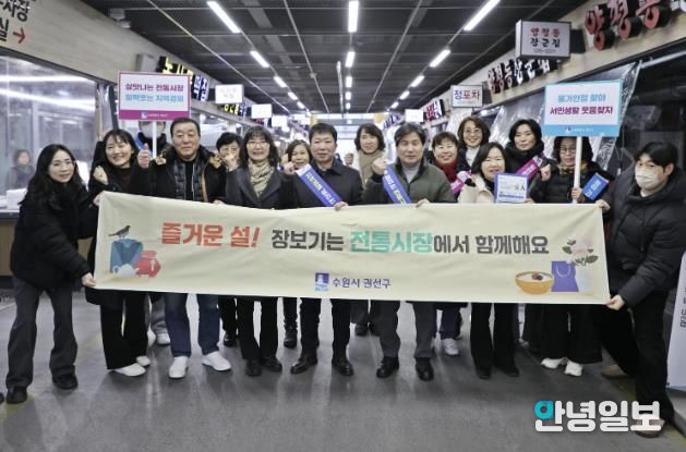 안녕일보 배윤 기자 | 수원시 권선구는 지난 9일 설 명절을 맞아 권선종합시장을 찾아 지역경제를 살리기 위한 ‘전통시장 장보기 캠페인’을 실시했다.