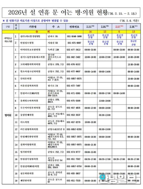 지역응급의료기관인 경기도의료원 안성병원과 안성성모병원은 연휴 기간 24시간 응급실을 상시 운영한다. 또한 병·의원 및 약국 248개소가 문을 열 예정이며, 명절 기간 중 운영 현황은 변동될 수 있으므로 방문 전 반드시 전화로 확인해야 한다.