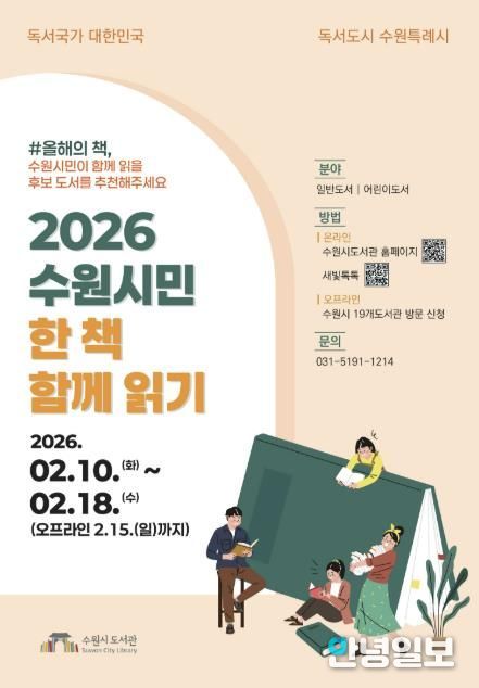 안녕일보 배윤 기자 | 수원시도서관이 ‘2026 수원시민 한 책 함께 읽기’ 올해의 책 후보 도서를 2월 18일까지 추천받는다. 수원시민 누구나 추천할 수 있다.