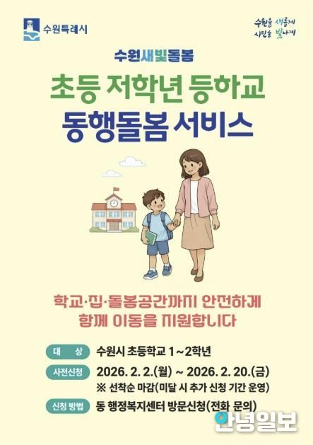 안녕일보 배윤 기자 | 수원특례시가 ‘초등 저학년 등하교 동행돌봄서비스’ 사전 신청 기간을 운영한다.