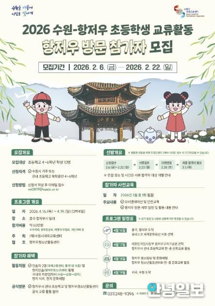 안녕일보 배윤 기자 | 수원특례시는 ‘2026 수원–항저우 초등학생 상호방문교류’에 참여할 초등학생 10명을 2월 22일까지 모집한다.