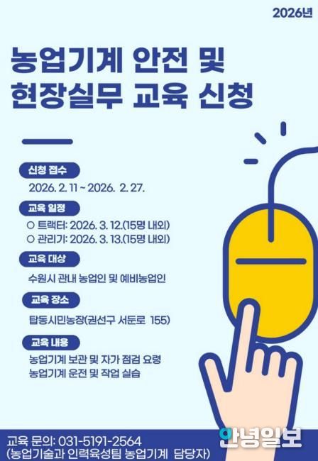 안녕일보 배윤 기자 | 수원특례시는 ‘2026년 농업기계 안전 및 현장실무 교육’ 수강생을 2월 27일까지 모집한다. 관내 (예비)농업인이 참여할 수 있다.