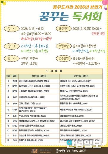 안녕일보 배윤 기자 | 김포시 풍무도서관은 오는 3월 13일부터 6월 12일까지 매주 금요일 총 12회에 걸쳐 2026년 상반기 ‘꿈꾸는 독서회’를 운영한다.