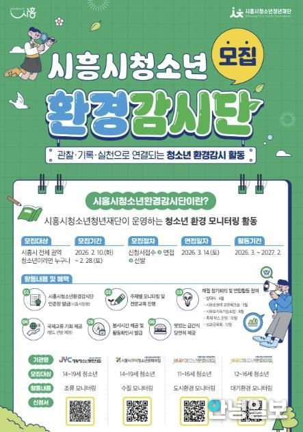 안녕일보 배윤 기자 | 시흥시청소년청년재단은 청소년이 지역 환경문제를 직접 관찰하고 기록하며, 이를 실천으로 연결하는 ‘제3기 시흥시청소년환경감시단’을 오는 2월 28일까지 모집한다.