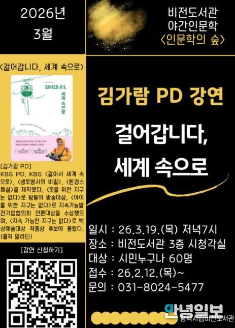 안녕일보 배윤 기자 | 평택시 비전도서관은 3월 19일 저녁 7시 김가람 KBS PD를 초청하여 ‘걸어갑니다, 세계 속으로’를 주제로 야간 인문학 강연을 진행한다.