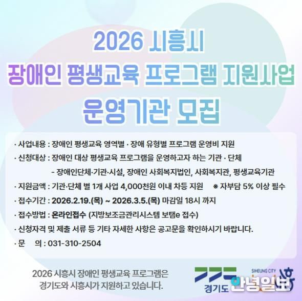 안녕일보 배윤 기자 | 시흥시는 장애인의 학습권을 보장하고 사회참여 기회를 확대하기 위해 ‘2026년 장애인 평생교육 프로그램 지원사업’을 추진하는 가운데 운영기관을 모집한다.