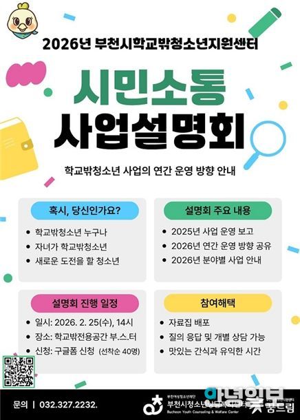 안녕일보 배윤 기자 | 부천시학교밖청소년지원센터는 오는 2월 25일, 오후 2시 학교밖청소년 전용공간 부.스.터. (송내어울마당 1층)에서 시민과의 소통을 확대하고 2026년 연간 운영계획을 공유하는 ‘사업설명회’를 개최한다고 밝혔다.