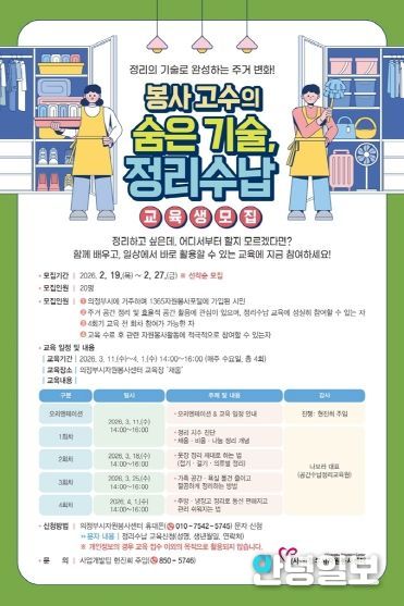 안녕일보 배윤 기자 | 의정부시자원봉사센터는 시민들의 주거환경 개선 역량 강화를 위해'봉사고수의 숨은 기술, 정리수납 교육'을 오는 3월 11일부터 4월 1일까지 매주 수요일 오후 2시부터 4시까지 총 4회에 걸쳐 진행하며, 이에 따른 참여자를 오는 2월 27일까지 모집한다.