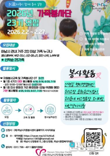 안녕일보 배윤 기자 | (재)하남시자원봉사센터는 가족이 함께 참여하는 자원봉사 프로그램인‘제23기 하남시자원봉사센터 가족봉사단’참여 가족을 선착순 25가족 모집한다.