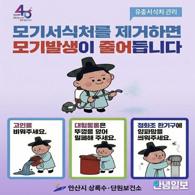 이미경 상록수보건소장은 “모기 서식처를 사전에 제거하면 발생을 크게 줄일 수 있다”며 “보건소의 철저한 방역에 시민들의 적극적인 협조가 더해진다면 더욱 쾌적하고 건강한 안산시를 만들 수 있을 것”이라고 말했다.