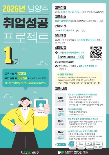 안녕일보 배윤 기자 | 남양주시는 오는 26일부터 청년 구직자의 취업 경잭력 강화를 위해 ‘2026 취업성공 프로젝트 1기’참여자를 모집한다고 밝혔다.