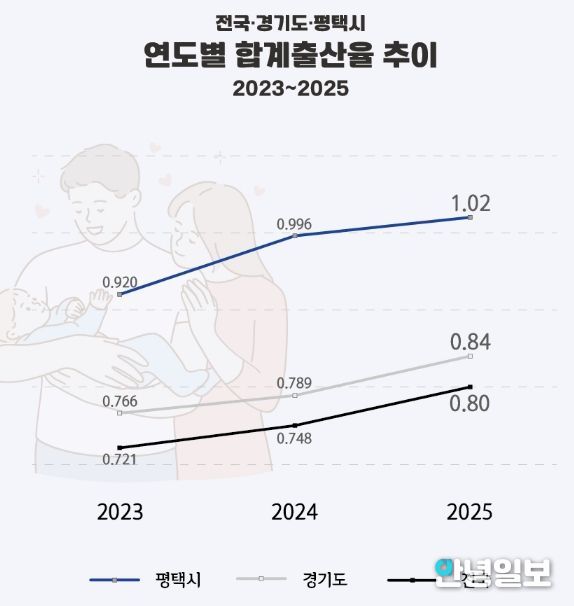 국가데이터처가 발표한 2025년 잠정 합계출산율에 따르면 평택시는 2024년 0.996에서 2025년 1.02로 상승하며 다시 1.0명을 넘어섰다. 2023년(0.92) 이후 2년 연속 상승이다.