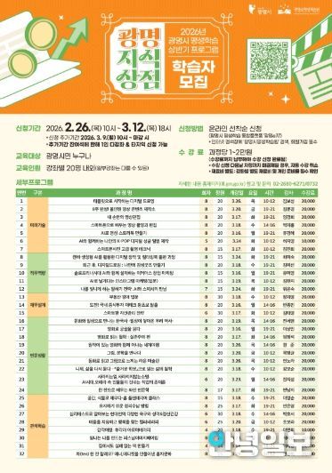 안녕일보 배윤 기자 | 광명시 평생학습원은 26일부터 시민 맞춤형 평생학습 프로그램인 ‘광명지식상점’ 2026년 상반기 학습자 700여 명을 모집한다.