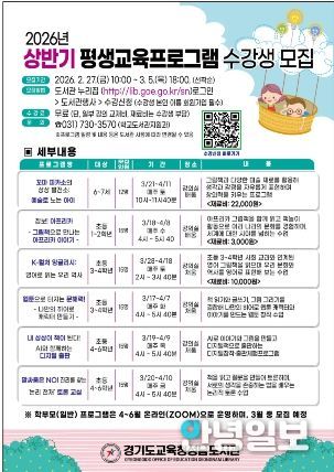 안녕일보 배윤 기자 | 경기도교육청성남도서관이 학생, 학부모, 다문화 청소년 및 어르신을 대상으로‘2026년 상반기 평생교육 프로그램’을 운영한다.