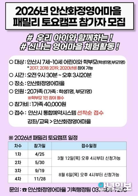 민진영 안산화정영어마을 원장(안산대학교 교양학부 교수)은 “패밀리 토요캠프는 가족이 함께 배우고 성장하는 경험에 의미를 두고 기획했다”며 “아이들이 말하기 중심 체험을 통해 영어 자신감을 키우고, 가정과 지역사회가 연계된 학습 환경 속에서 지속적으로 영어를 접할 수 있는 기반이 되길 바란다”고 말했다.