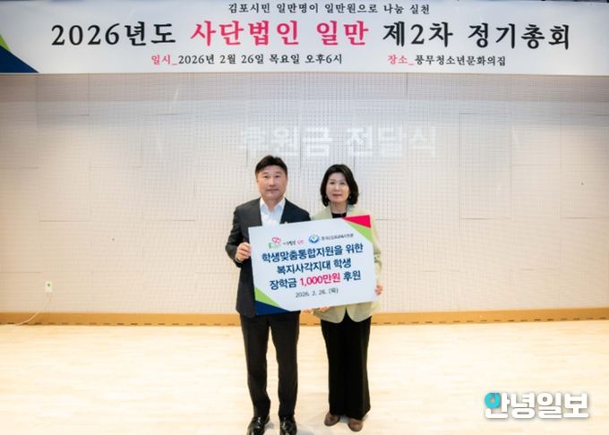 안녕일보 배윤 기자 | 경기도김포교육지원청은 2월 26일 풍무청소년문화의집에서 열린 일만장학회 정기총회에서 학생맞춤통합지원을 위한 장학금 기탁식을 가졌다.