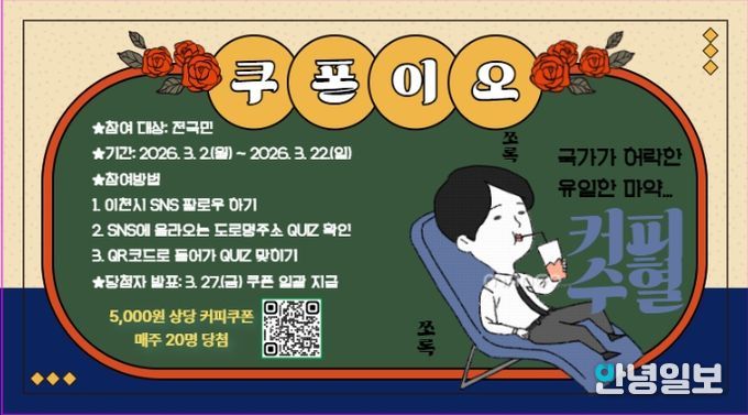 도로명주소 온라인 퀴즈 이벤트는 오는 3월 2일부터 3월 22일까지 3주간 진행되며 이천시 사회관계망서비스(SNS) 채널을 통해 누구나 참여할 수 있고 정답자 중 추첨을 통해 5,000원 상당 커피 쿠폰(60명)을 증정할 예정이다.