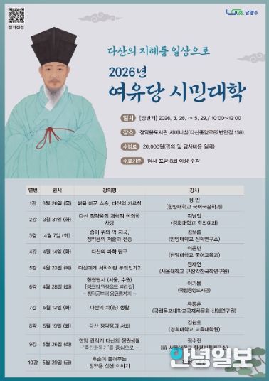 안녕일보 배윤 기자 | 남양주시는 오는 26일부터 5월 29일까지 정약용도서관에서 다산 정약용 선생의 삶과 사상을 시민의 눈높이에서 살펴보는‘2026 여유당 시민대학’에 참여할 수강생을 모집한다고 3일 밝혔다.