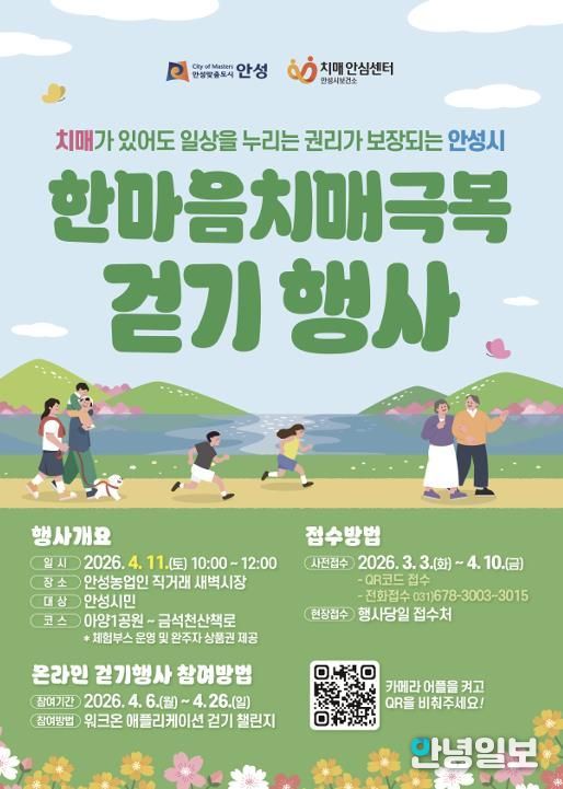 안녕일보 배윤 기자 | 안성시치매안심센터는 4월 11일 토요일에 개최되는 ‘2026 한마음 치매극복 걷기행사’ 참여자를 3월 3일부터 4월 10일까지 사전 접수로 모집한다. 한마음 치매극복 걷기행사는 치매 예방에 효과적인 ‘걷기’를 실천하며 치매 극복을 기원하고, 치매 예방에 대한 지역주민의 관심을 높이며 치매에 대한 부정적 인식을 개선하기 위해 마련됐다.