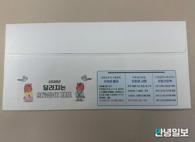 우편봉투에는 ▲의료급여 부양비 부과 제도(부양의무자가 소득 일부를 수급권자에게 생활비로 지원한다고 간주하고 수급자의 소득에 반영하는 제도) 폐지 ▲연간 외래 진료 이용 횟수가 365일을 초과하는 경우, 초과되는 외래진료비에 대해 본인 부담률 30%를 적용하는 외래본인부담차등제 ▲2026년 의료급여 수급자 기준 중위소득 40%에 해당하는 선정기준액 등 수급자에게 꼭 필요한 정보가 알기 쉽게 정리돼 있다.