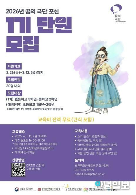 안녕일보 배윤 기자 | 포천문화관광재단은 지역 아동·청소년을 위한 문화예술교육 프로그램 ‘2026 꿈의 극단 포천’의 1기 신규 단원을 오는 3월 12일까지 모집한다.