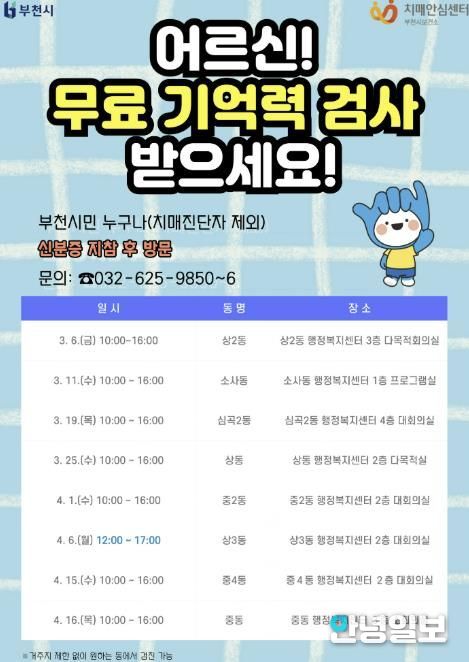 안녕일보 배윤 기자 | 부천시는 치매 조기 발견과 중증화 예방을 위해 3월 6일부터 4월 16일까지 ‘2026년 상반기 찾아가는 치매조기검진(동별검진)’을 실시한다.