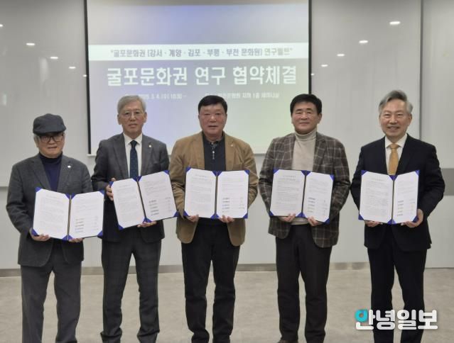 안녕일보 배윤 기자 | 부천문화원과 강서문화원, 계양문화원, 김포문화원, 부평문화원은 3월 4일 부천문화원에서 ‘굴포문화권’을 토대로 하는 연구교류 협약식을 체결했다. 이로써 ‘굴포’를 같은 문화권으로 하는 부천문화원·강서문화원·계양문화원·김포문화원·부평문화원은 학술대회와 콘텐츠 발굴 사업 등 다양한 지역학 자원을 발굴하고 활성화하기 위해 최초로 지역학 연구 모델을 구축하게 됐다. 특히, 이번 협약은 경기도(부천, 김포), 서울특별시(강서), 인천광역시(계양, 부평)를 잇는 ‘지역학’중심의 연구 교류를 마련한다는 점에서 주목된다.