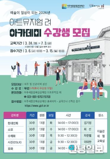 안녕일보 배윤 기자 | 여주세종문화관광재단 아트뮤지엄 려에서 2026년 3월 6일 ~ 3월 15일 동안 아트뮤지엄 려 아카데미 강좌 수강생을 모집한다고 밝혔다.