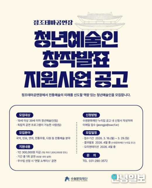 안녕일보 배윤 기자 | 수원문화재단 정조테마공연장은 오는 29일까지 ‘2026 정조테마공연장 청년예술인 창작발표 지원사업’에 참여할 청년예술인을 모집한다. 이번 사업은 전통예술 분야의 역량 있는 청년예술인을 발굴하고, 창작 활동의 기회를 제공하기 위해 마련했다.