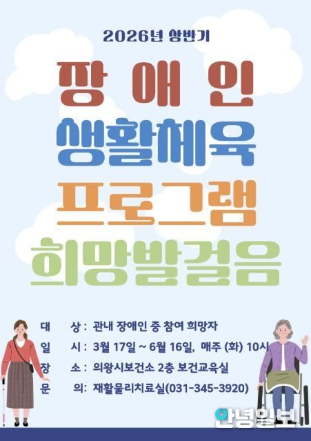 안녕일보 배윤 기자 | 의왕시 보건소가 지역 내 장애인의 건강관리 및 재활 의지 향상을 위해 운영되는 2026년 상반기 장애인 생활체육 프로그램 '희망발걸음'의 참여자를 모집한다.