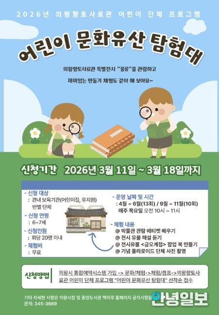 안녕일보 배윤 기자 | 의왕시 향토사료관이 오는 4월부터 6월, 9월부터 10월 매주 목요일에 어린이 단체 체험프로그램 ‘어린이 문화유산 탐험대’를 운영한다.