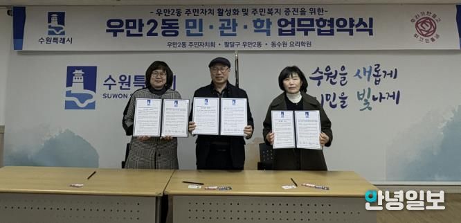 안녕일보 배윤 기자 | 수원시 팔달구 우만2동 주민자치회는 지난 10일, 우만2동‧동수원요리학원과 함께 협력사업 추진을 위한 민‧관‧학 협약을 체결했다.