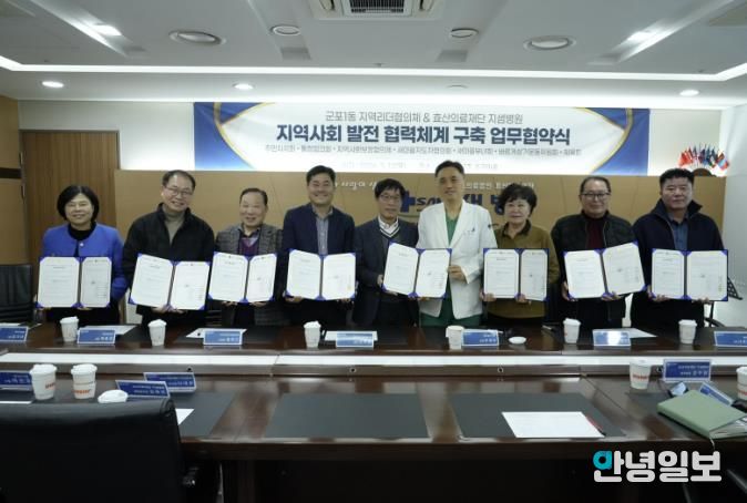 안녕일보 배윤 기자 | 군포1동 지역리더협의체(주민자치회 등 7개 단체)와 효산의료재단 지샘병원은 지역사회 건강증진 및 상호 협력 강화를 위해 3월 12일 지샘병원에서 업무협약(MOU)을 체결했다.