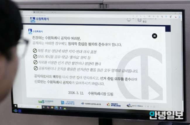 수원시 관계자는 “공직자의 선거 관여 행위는 선거의 공정성을 훼손하고 주권자인 국민의 신뢰를 떨어뜨리는 주요 요인”이라며 “전국동시지방선거 전까지 공직자들에게 선거중립의무, 위반행위 등을 지속해서 안내하겠다”고 말했다.