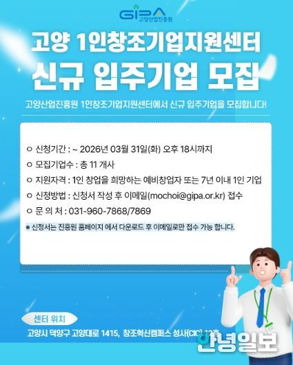 안녕일보 배윤 기자 | 고양산업진흥원이 ‘고양 1인 창조기업 지원센터’ 2026년 1차 신규 입주기업을 모집한다.
