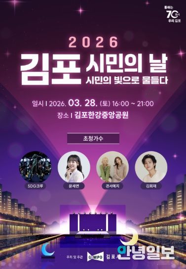 안녕일보 배윤 기자 | 김포시는 오는 3월 28일 김포한강중앙공원에서 ‘2026년 김포시민의 날 기념행사’를 개최한다고 밝혔다. 이번 행사는 김포시 시승격일(4월 1일)을 기념해 시민의 화합과 자긍심을 높이고, 시의 발전을 함께 기념하기 위해 마련됐다.