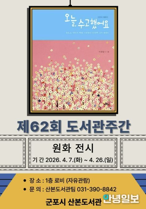 안녕일보 배윤 기자 | 군포시 산본도서관은 도서관주간을 맞아 시민들의 독서문화 확산과 책을 통한 공감의 시간을 마련하기 위해 작가와의 만남, 북토크, 원화전시 등 다양한 프로그램을 운영한다.