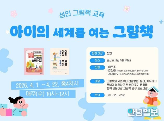 안녕일보 배윤 기자 | 파주시 문산도서관은 그림책의 가치와 활용 방법을 이해하고, 지역사회에 책 읽어주기 문화를 확산하기 위한 그림책 교육 프로그램 ‘아이의 세계를 여는 그림책’을 오는 4월 1일부터 4월 22일까지 운영한다.