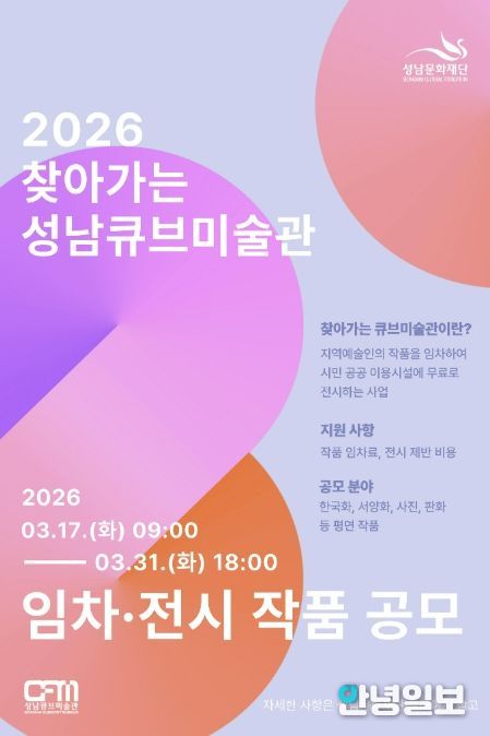 안녕일보 배윤 기자 | 성남문화재단은 지역예술인의 창작 환경 지원을 다각화하고 시민들의 문화예술 향유기회를 확대하고자 ‘2026 찾아가는 성남큐브미술관’ 작품 임차 공모를 진행한다.