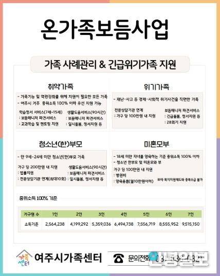 안녕일보 배윤 기자 | 여주시가족센터는 복합적인 어려움을 겪는 가족을 발굴하고 지원하기 위해, 2026년 ‘취약·위기가족 지원사업(온가족보듬사업)’을 예년보다 확대하여 본격 가동한다고 밝혔다.